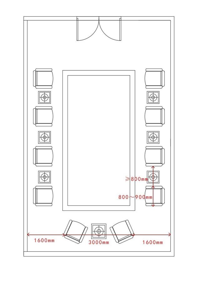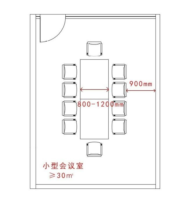 6.4.3 小型會議室面積不宜小于30㎡可供15人會議;小型會議室會議桌為:桌面寬度0.8m~1.2m,桌子高度0.75m~0.8m;椅子與墻面的中間過道不應少0.9m。