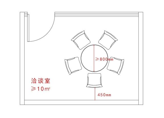 6.6.1 洽談室是簡短交談、快速接待使用的功能室,洽談室一般為封閉性,談話有一定的私密性。洽談室的面積不應小于10平方,可容納3~5人交談。