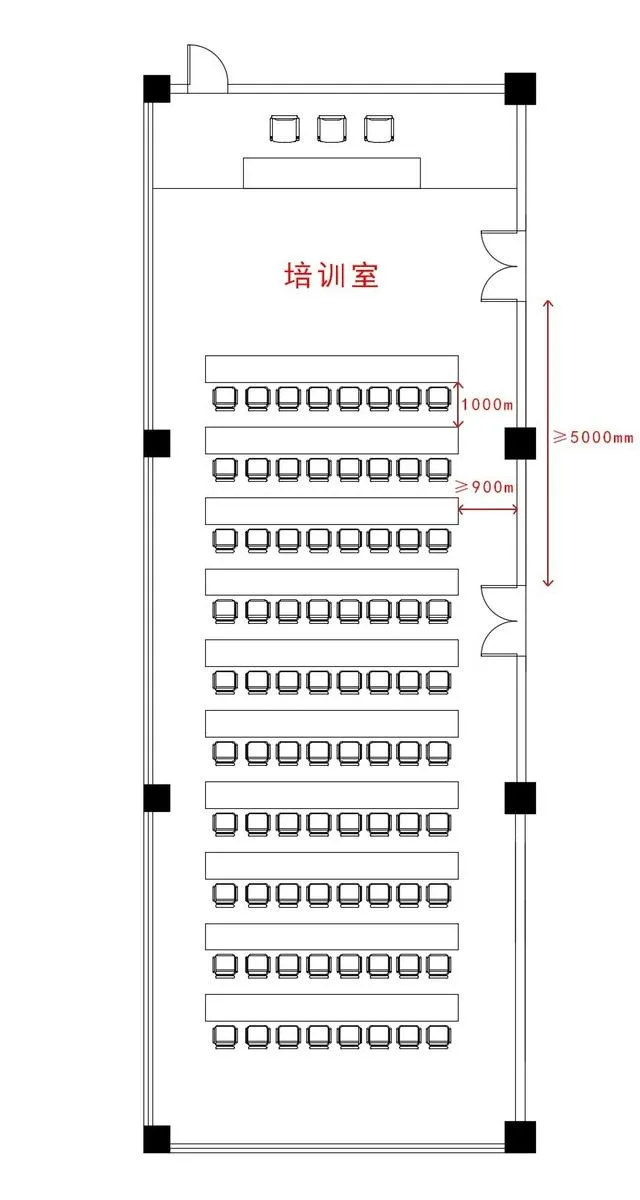 6.4.5 培訓室前后桌子的距離應不小于0.9m~1m;椅子與墻面的中間過道不應少0.9m。培訓桌桌面寬度為0.4m~0.6m ,桌子高度為0.7m~0.8。依據(jù)建筑設計防火規(guī)范規(guī)定,達到60平方的獨立開間需設計兩個以上的安全疏散出口,其相鄰兩個安全出口最近邊緣的水平距離不應小于5m。超60平方的培訓室墻面飾面應設計吸音板材。