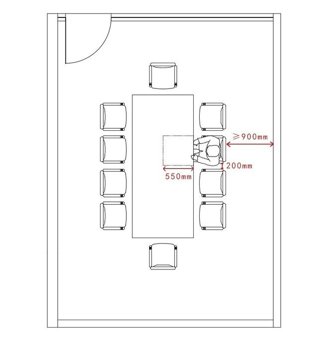 6.4.6 單個空間尺寸 :椅子左右分隔尺寸宜為0.2m,會議桌的活動范圍為0.5m,椅子與墻面的中間過道不應少0.9m。